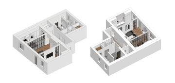 Obývací prostor a kuchyně je rozdělena velkou průchozí prosklenou stěnou složenou z ocelových profilů. Tento prvek je jakožto odkaz na Ostravu - produkce oceli. Mezi ložnicí a obývacím pokojem je umístěn podobný systém jako dveře.